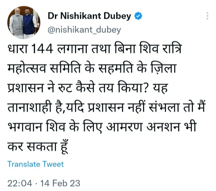 AJ डेस्क: देवघर में शिवरात्रि को लेकर तैयारी जोरों पर है। सांसद निशिकांत दुबे ने प्रशासन को चुनौती देते हुए कहा है कि अगर प्रशासन शिव बारात को लेकर मनमानी करेगी तो वह आमरण अनशन पर बैठ जायेंगे। देवघर अनुमंडल क्षेत्र में निषेधाज्ञा लागू की गयी है। इस फैसले का सांसद विरोध कर रहे हैं। शिव बारात निकालने के लिए भी आदेश जारी किया गया है।एसडीओ के इस आदेश के बाद शहर में कई संगठनों ने इसका विरोध शुरू कर दिया है।
