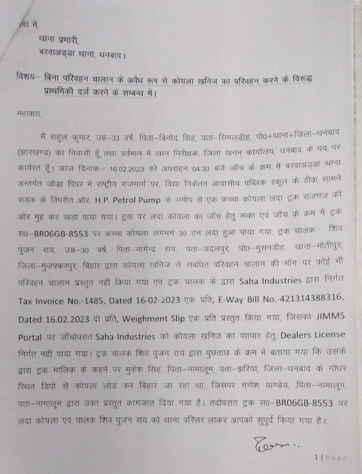 खान निरीक्षक ने बरवा अड्डा थाना में दिए गए लिखित आवेदन में कहा है कि झरिया का मुकेश गोधर के अवैध डिपो से तीस टन कोयला लोड कर बाहर भेज रहा था। ट्रक ड्राइवर के बयान पर FIR तैयार किया गया है। इस कोयले पर लगी कागजात किसी गणेश पांडे के द्वारा उपलब्ध कराए जाने की बात कही गई है।