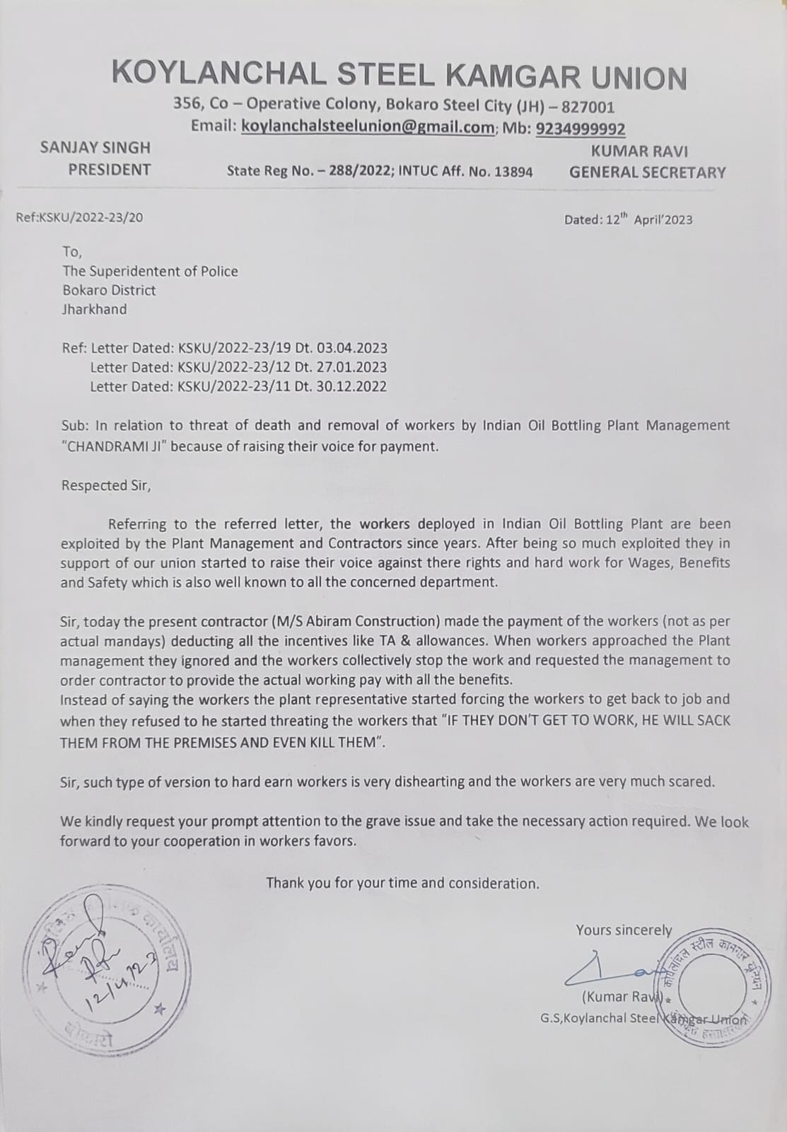 प्लांट प्रबंधन के दुराग्रहपूर्ण रवैये के चलते काम रोकने पर मजदूर मजबूर हो गए। प्लांट प्रबंधक के द्वारा मजदूरों को चेतावनी और जान से मारने की धमकी देते हुए, काम पर लौटने का आदेश दिया गया पर मजदूरों की एकता अटूट रही। कोयलांचल स्टील कामगार यूनियन के महामंत्री कुमार रवि चौबे द्वारा पुलिस अधीक्षक को पूरी घटना की जानकारी देते हुए मज़दूर की सुरक्षा की अपील की। पुलिस अधीक्षक ने मामले को समझते हुए तुरंत ही दिशा निर्देश जारी करते हुए मजदूरों की सुरक्षा और मामले को जल्द से जल्द सुलझाने का आश्वासन दिया।
