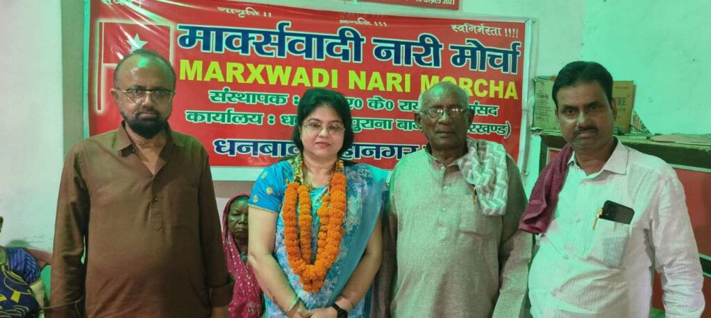 AJ डेस्क: रविवार को हुए कमिटी चुनाव में शुक्ला दास को धनबाद झारखण्ड महानगर, मार्क्सवादी नारी मोर्चा (मासस) के नए अध्यक्ष के रूप में चयनित किया गया। इस कार्यक्रम में केंद्रीय राष्ट्रीय अध्यक्ष आंनद महतो, महानगर अध्यक्ष रुस्तम अंसारी, केंद्रीय सचिव हरि प्रसाद पप्पू, जिला अध्यक्ष बिनोद पासवान, सुभाष चटर्जी, सुभाष सिंह, विजय पासवान, मायामु जिला सचिव राणा चटर्जी, पार्वती चक्रवर्ती सम्मिलित होकर उनकी हौसला अफजाई कर उन्हें आशीष दिया।