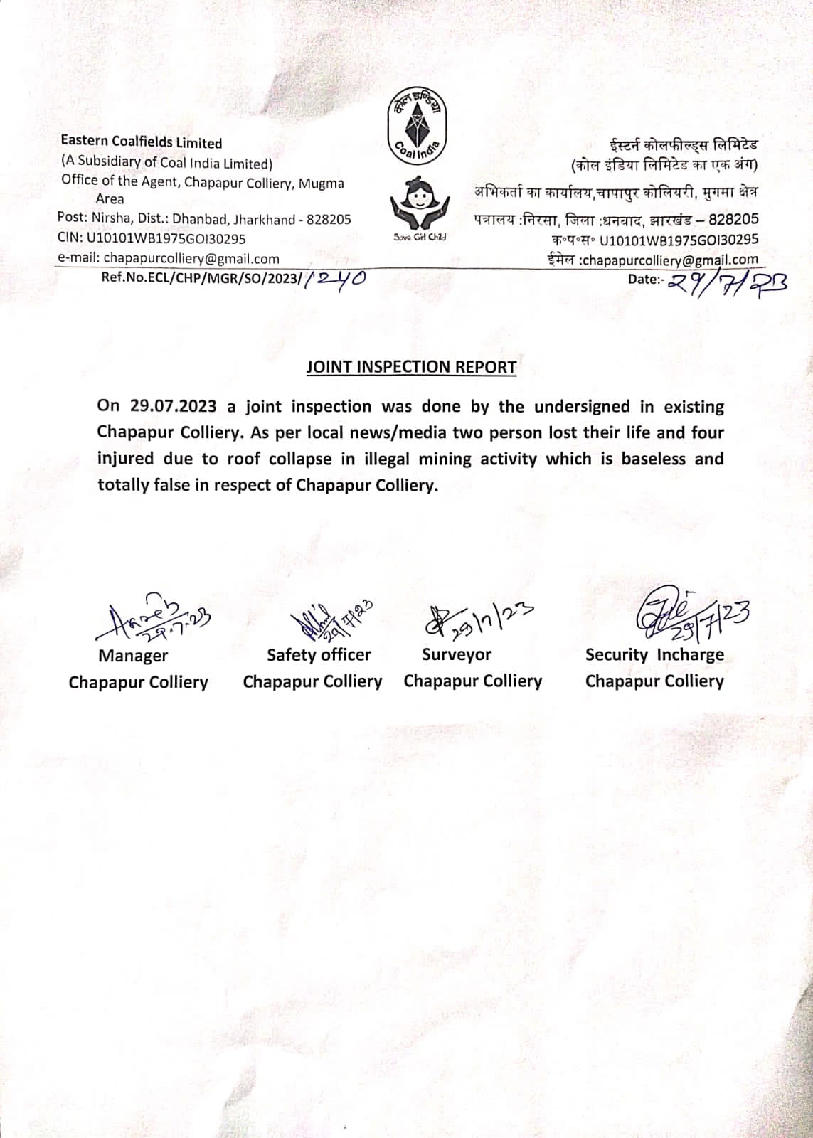 चापापुर कोलियरी के खदान में पिछले दिनों अवैध कोयला खनन के दौरान चाल धसने से दो की मौत और चार के घायल होने की खबर जंगल की आग की तरह फैली थी। इसके बाद कोलियरी के मैनेजर, सेफ्टी ऑफिसर, सर्वेयर और सिक्योरिटी इंचार्ज ने संयुक्त रूप से पूरे मामले की जांच किया। जांच टीम ने अपनी रिपोर्ट में कहा है कि खनन के दौरान चाल धसने से दो की मौत और चार के घायल होने की खबर आधारहीन है। वहां किसी तरह का हादसा हुआ ही नहीं है।