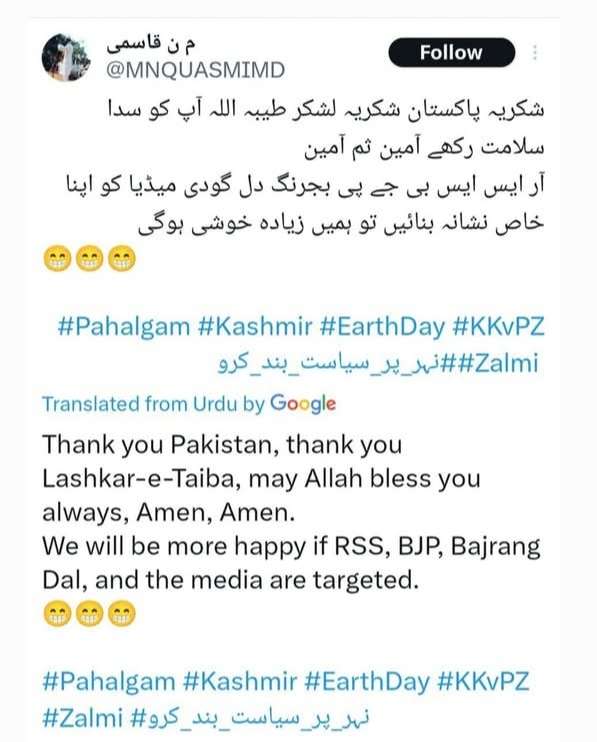 थैंक यू पाकिस्तान, थैंक यू लश्कर ए तैय्यबा, मे अल्लाह ब्लेस यू ऑलवेज, आमीन, आमीन। वी विल बी मोर हैप्पी इफ आरएसएस, बीजेपी, बजरंग दल एंड द मीडिया आर टारगेटेड।