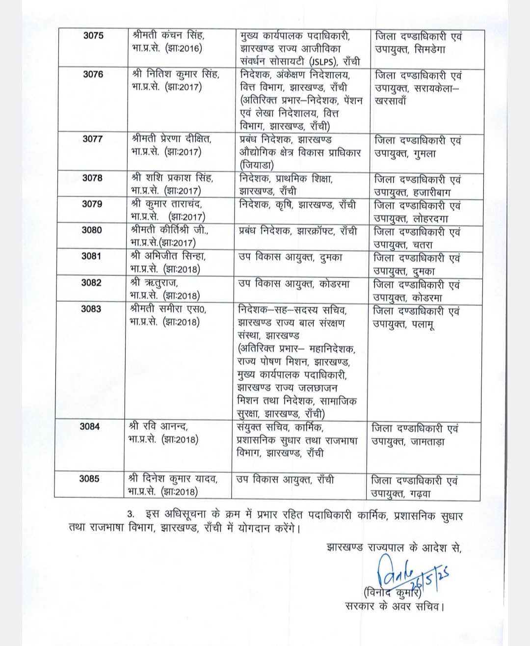 BREAKING NEWS झारखंड धनबाद के उपायुक्त बदले,आदित्य रंजन नए डीसी 6 months ago Analjyoti AJ डेस्क :झारखंड सरकार के कार्मिक,प्रशासनिक एवं राज्य भाषा विभाग के जारी अधिसूचना के मुताबिक आज बीस अधिकारियों का इधर से उधर तबादला किया गया है।कई जिला के उपायुक्त बदले गए हैं।देखें पूरी लिस्ट ———- Continue Reading Previous लोक सभा अध्यक्ष दो दिवसीय दौरे पर रांची पहुंचे,भव्य स्वागत हुआNext कारगिल और डुमरी जोर के दर्जनों मुहाने भरे गए,मामला अवैध खनन का Leave a Reply Cancel replyYour email address will not be published. Required fields are marked *Comment Name * Email * Website