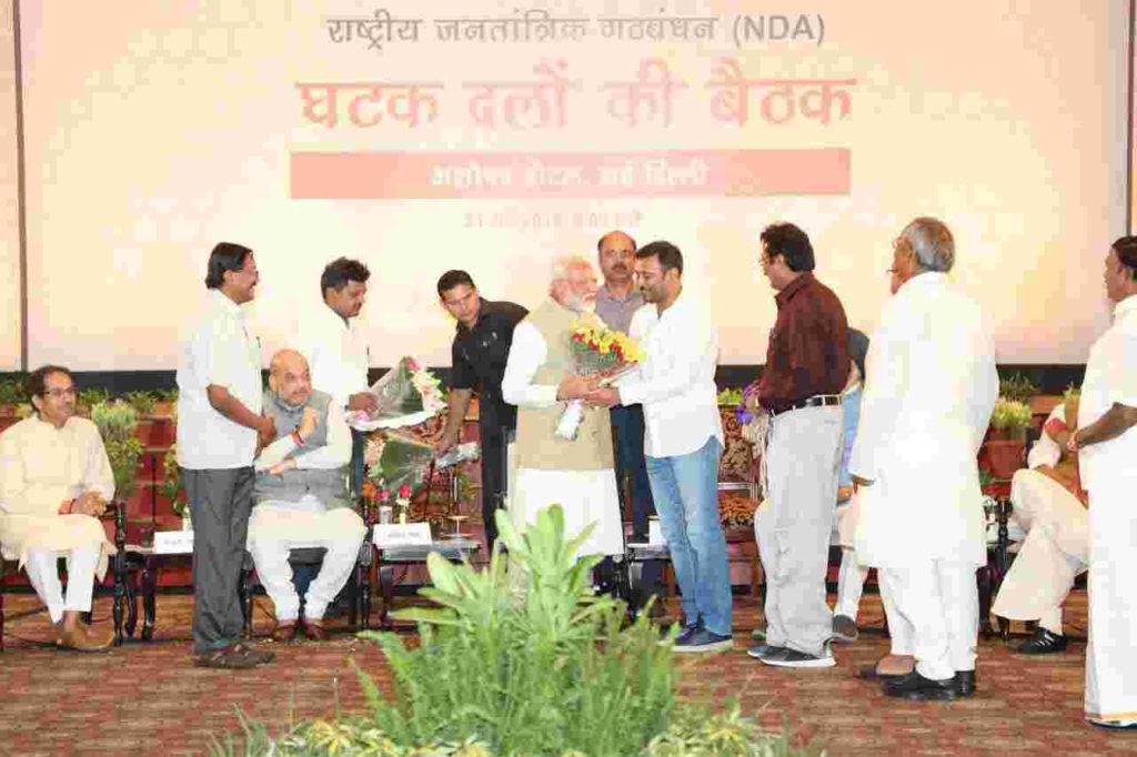 हर मौके को बखूबी भंजाने में माहिर अमित शाह ने इस कार्यक्रम को नाम दिया “स्वागत एवम आभार मिलन समारोह”। भाजपा के घटक दलों के नेताओं का हौसला आफजाई करने के लिए प्रधानमंत्री नरेंद्र मोदी भी इस समारोह में शामिल हुए थे। गठबंधन के नेताओं ने नरेंद्र मोदी का जोरदार स्वागत किया। इससे पहले लोक सभा चुनाव के एग्जिट पोल में राजग को बहुमत मिलने के पूर्वानुमान के बीच प्रधानमंत्री नरेंद्र मोदी ने अपने मंत्री परिषद के सदस्यों से मुलाकात कर उनका आभार प्रकट किया। भाजपा के रात्रि भोज में झारखण्ड से आजसू प्रमुख सुदेश महतो के अलावा राम विलास पासवान, हरसिमरत कौर, अनुप्रिया पटेल सहित भाजपा के कई वरिष्ठ नेता शामिल हुए।