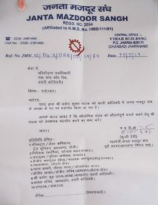 जनता मजदूर संघ की महामंत्री कुंती सिंह के हस्ताक्षर से संगठन में कुछ फेर बदल किये गए हैं। चासनाला के सचिव, बरारी ब्रांच के महीप सिंह और असंगठित के नेता ललन पासवान के पद पर किसी और की प्रतिनियुक्ति का पत्र जारी किया गया है। इन श्रमिक नेताओं को दिए गए पत्र में नए की नियुक्ति का जिक्र तो किया गया है लेकिन इनके हटाए जाने की बात नही कही गयी है। जनता मजदूर संघ के इन पदाधिकारियों ने कल धनबाद जेल जाकर विधायक संजीव सिंह से भेंट कर उन्हें बताया कि आपके निर्देश पर भाजपा के लिए काम करने का खामियाजा उन्हें भुगतना पड़ रहा है।