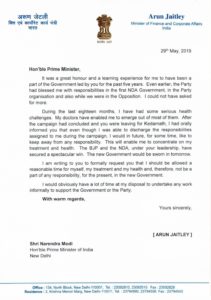 अरुण जेटली आगे लिखते हैं कि जिम्मेदारियों से दूर रह कर वो अपने उपचार और स्वास्थ्य पर ध्यान दे सकेंगे। बीजेपी और एनडीए ने आपके नेतृत्व में अविस्मरणीय जीत हासिल की है। गुरुवार को अगली सरकार शपथ लेगी। मैं यह खत औपचारिक तौर पर ये बताने के लिए लिख रहा हूं कि मुझे इलाज और बेहतर स्वास्थ्य के लिए कुछ समय चाहिए। इसलिए वो नई सरकार में किसी तरह की जिम्मेदारी उठाने में सक्षम नहीं होंगे। ये बात अलग है कि अगर उन्हें किसी तरह की जिम्मेदारी दी गई तो वो उसे अनौपचारिक तौर पर निर्वहन करेंगे।