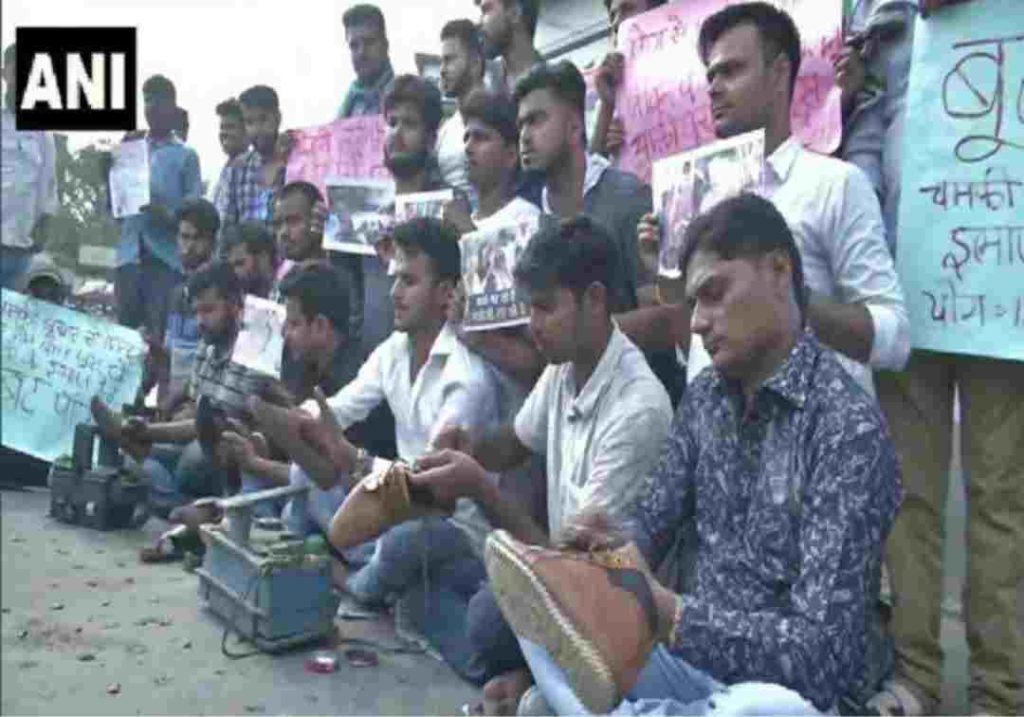 Patna:'Jan Adhikar Chhatra Parishad' members polish shoes to collect money for children affected due to Acute Encephalitis Syndrome (AES).A member says,'Crores are being spent on Yoga day celebrations across the country,we'll collect the money&give it for children.'(21-06) #Bihar pic.twitter.com/iw2bxIyHwN